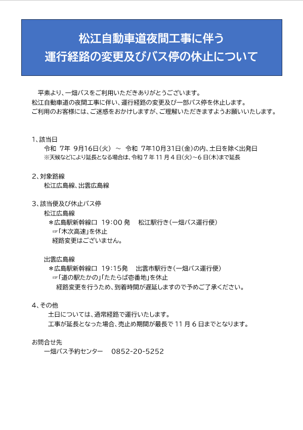 9/16~ 松江道夜間工事に伴う高速バス停の休止について