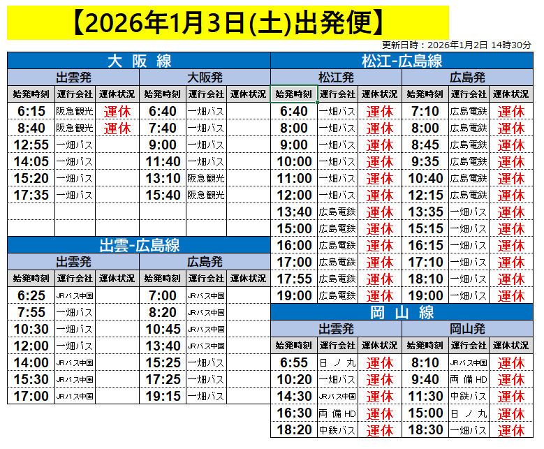 気象状況や道路状況の悪化により、運行予定の便におきましても始発地への引き返し、急遽の運休、大幅な遅延が発生する場合がございます。