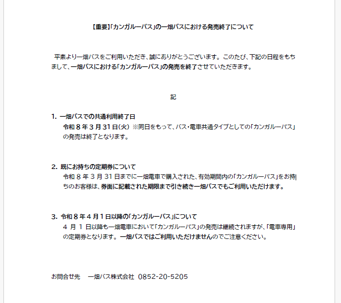 【重要】「カンガルーパス」の一畑バスにおける発売終了について