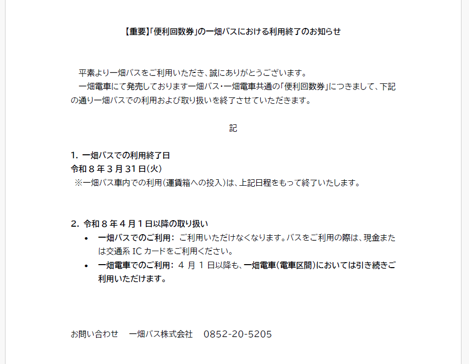 【重要】便利回数券の一畑バスにおける利用終了のお知らせ