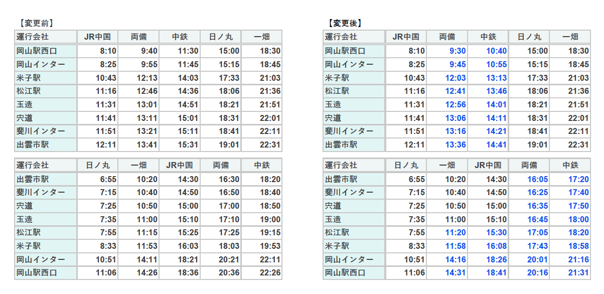 高速バス岡山~出雲線(ももたろうエクスプレス)につきまして、2026年4月1日(水)運行分よりダイヤ改正を実施しますので、お知らせいたします。